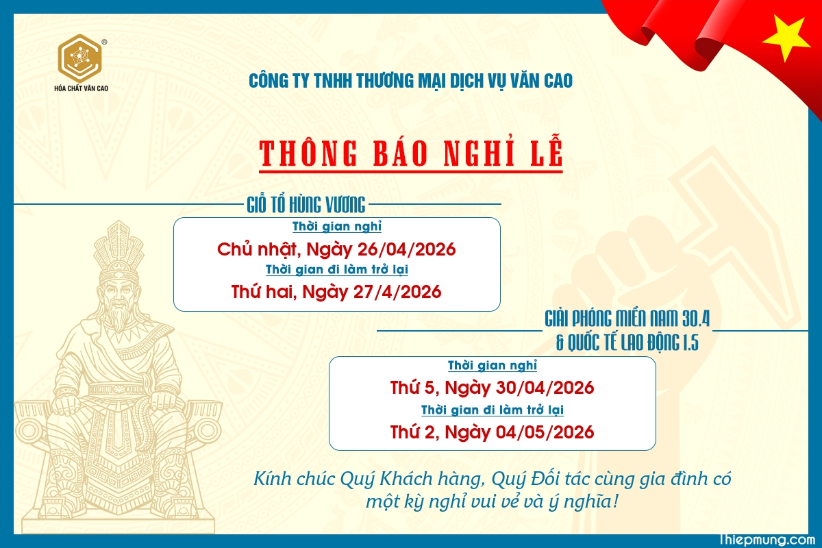 Hóa chất Văn Cao xin trân trọng thông báo Lịch nghỉ lễ Giỗ Tổ Hùng Vương và Lễ Giải phòng Miền Nam 30/4 -1/5 đến Quý Khách hàng, Quý Đối tác.